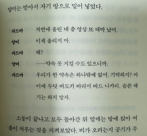 가라앉고자 하면 사람을 찐득하게 바닥까지 내려올 수 있는 사건들 속에서 주인공 손열매는 때로 사람답게 사는 것이 무엇인지 호통치듯 외치며, 성의껏 위로도 하며 함께한다. 물론 그렇게 해서 문제가 해결까지 이르지는 않는다. 그럼에도 자기 앞만 보고 걸어가다가 옆 사람을 한번 돌아보게까지 하는 정도의 힘은 가지고 있다. 슬픈 이야기를 하지 않는 것으로 슬픈 일이 없어지지는 않겠지만 벗어나야 할 때는 잠시 눈을 다른 곳에 돌리는 것도 한 가지 방법이다. 겪어본 사람은 알겠지만, 슬픔은 길고 질겨서 이겨내는데에 여러가지 방법이 필요하다.