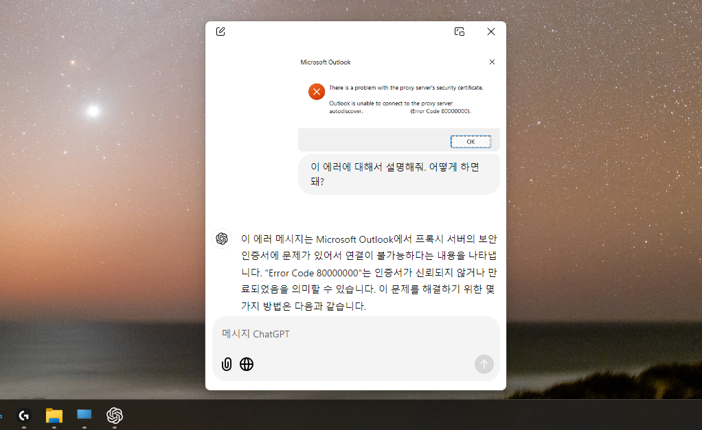 이 중 화면의 스크린샷을 찍고 바로 화면에 대해 물어보는 Use case가 꽤 유용할 것 같습니다. 이를 테면 에러메시지가 뜨면 챗지피티한테 물어보는 거죠.