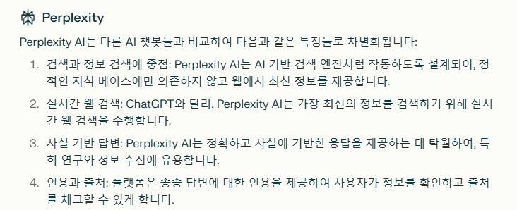 데스크리서치 업무 목적으로 일을 시켜보면 확실히 perplexity 대비해서 최신의 정보를 정확하게 정리하지 못하는 면이 있었습니다. 그래서 사실확인, 정확성을 필요로 하는 검색 관련 일은 perplexity를, 발산적 사고가 필요한 일에는 chatGPT를 시키고 있었습니다.